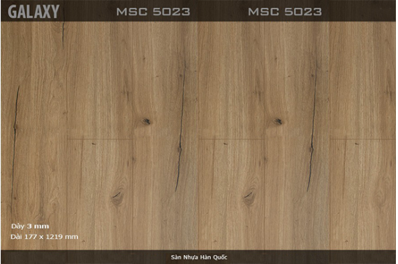Sàn nhựa Galaxy MSC 5023 được sản xuất công nghệ Hàn Quốc sản xuất tại Việt Nam, đạt tiêu chuẩn xuất khẩu Mỹ và Châu Âu. Sàn nhựa Vinyl Galaxy có thành phần chính là 90% nhựa PVC và 10% là bột đá + phụ gia khác.